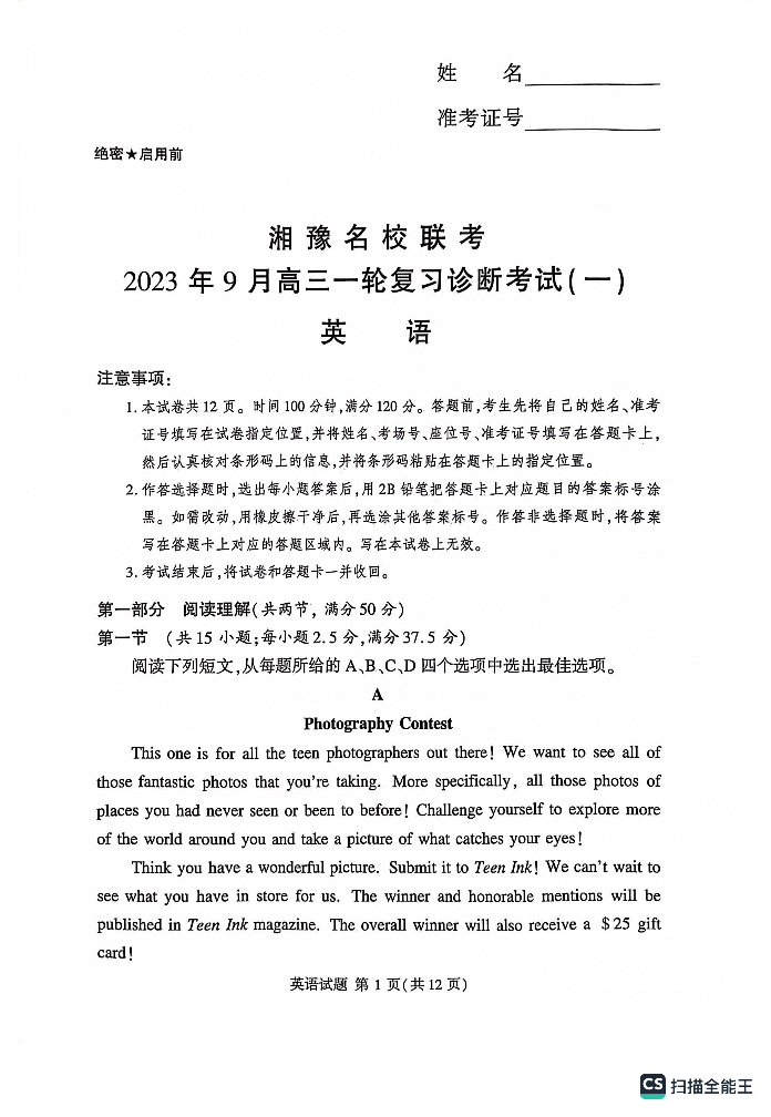 河南省湘豫名校2024.9高三年级联合月考试题英语+答案