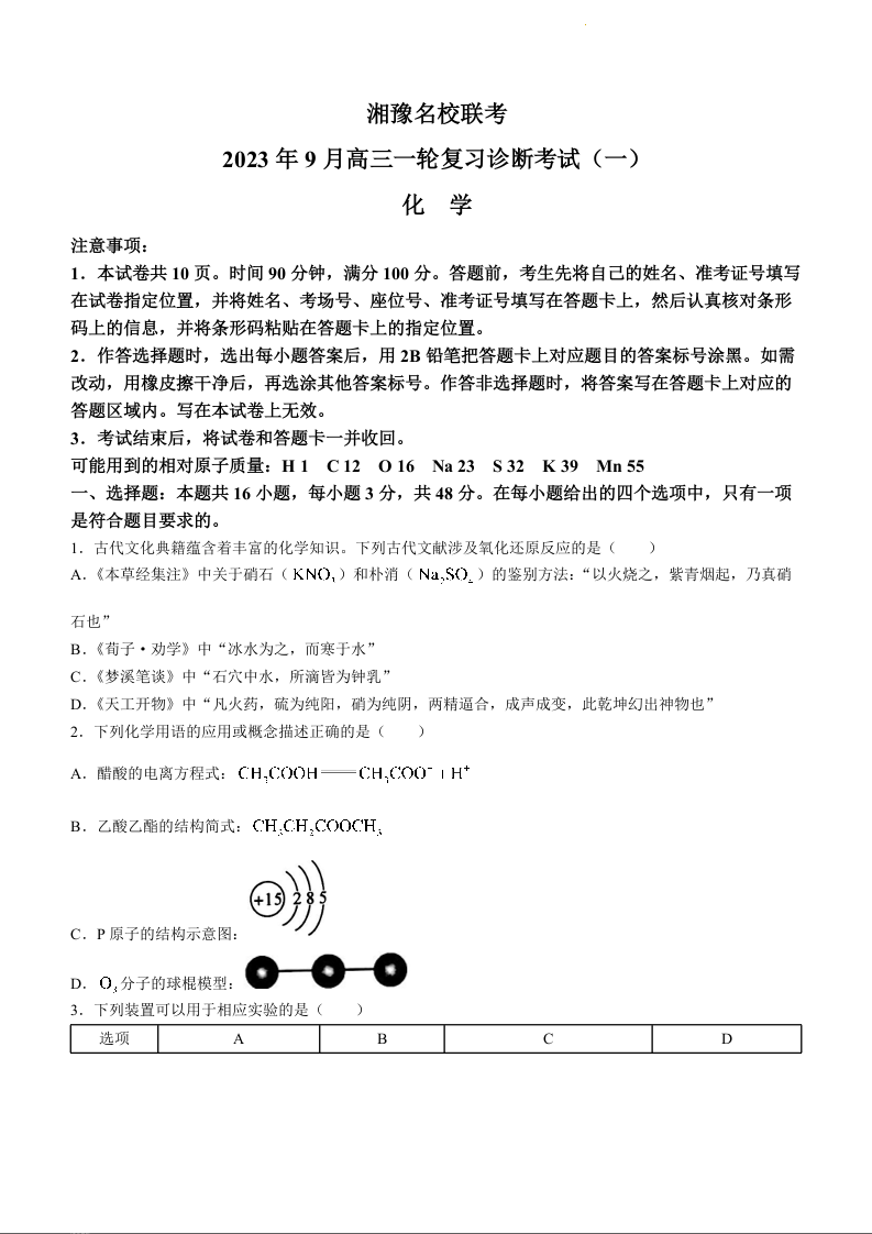 河南省湘豫名校2024.9高三年级联合月考试题化学+答案