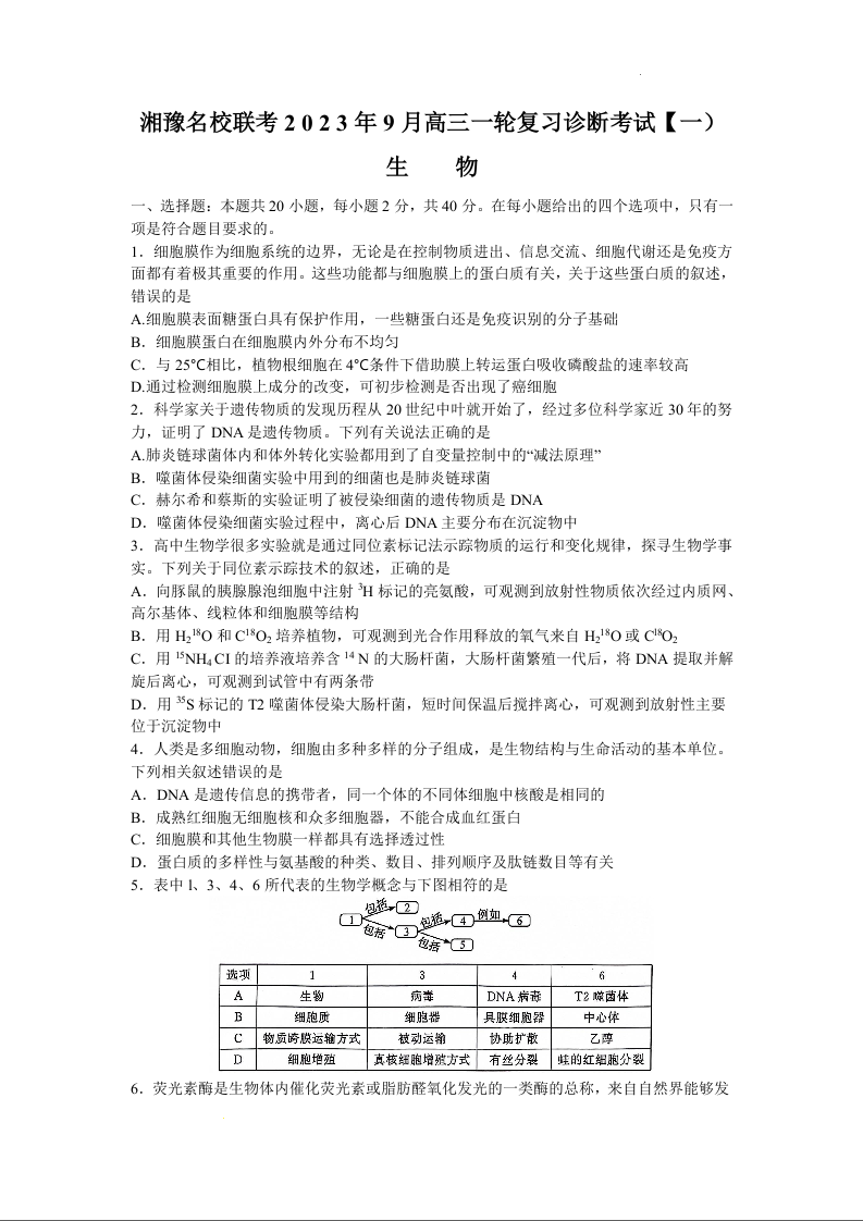 河南省湘豫名校2024.9高三年级联合月考试题生物