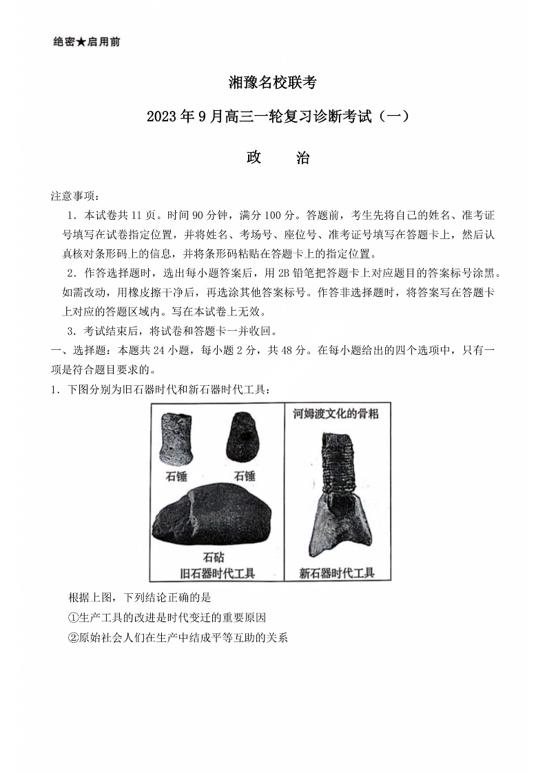 河南省湘豫名校2024.9高三年级联合月考试题政治+答案