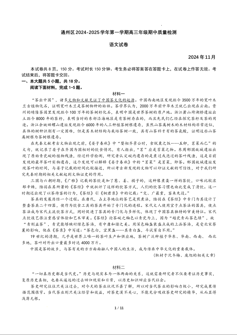 北京市通州区2025届高三上学期11月期中质量检测试卷语文含答案