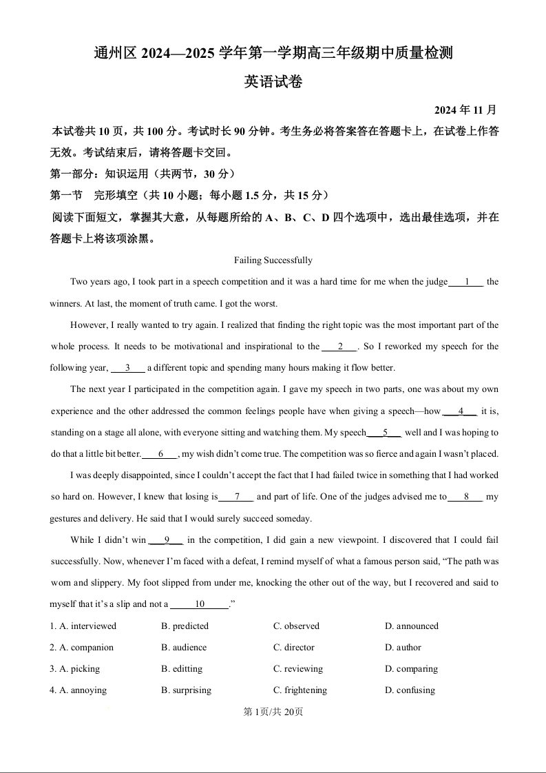 北京市通州区2025届高三上学期11月期中质量检测试卷英语(精品解析版)