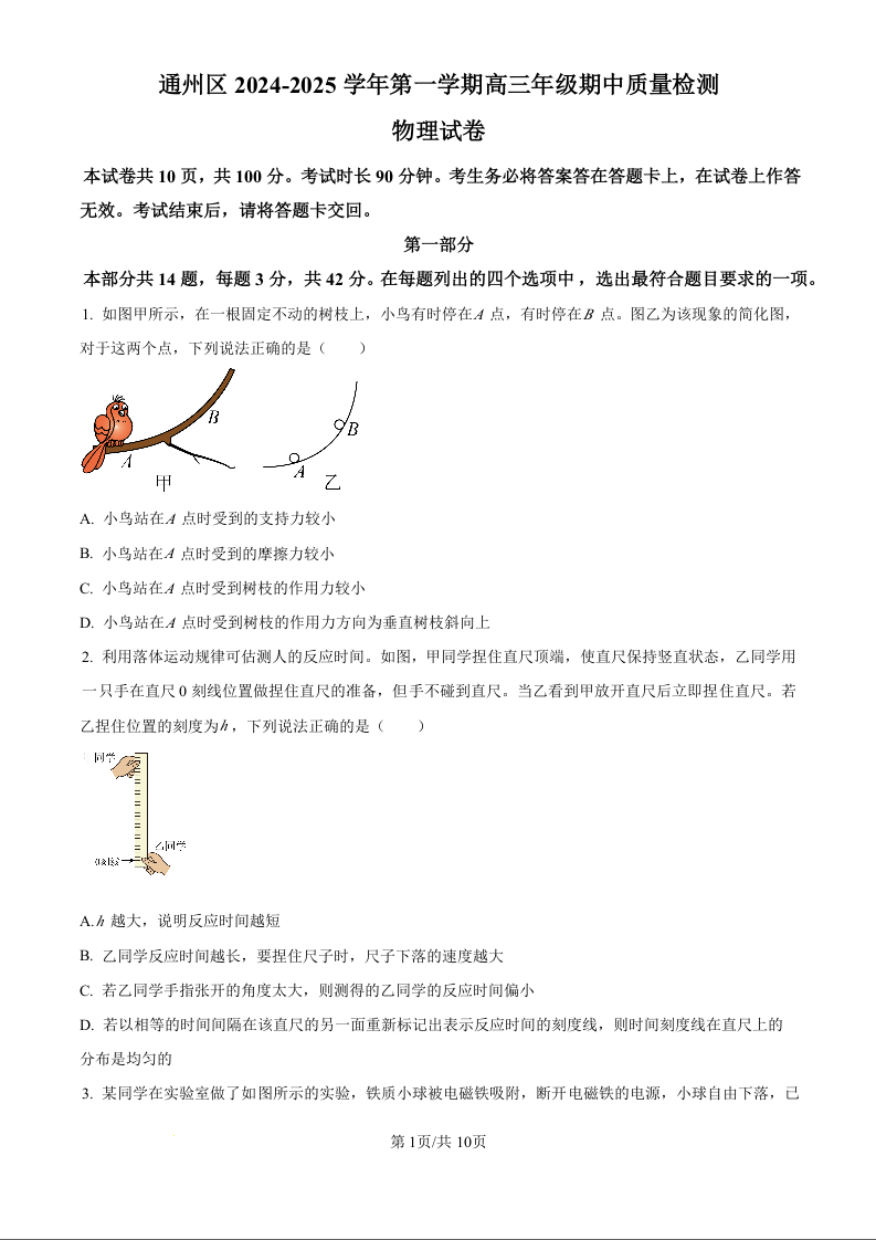 北京市通州区2025届高三上学期11月期中质量检测试卷物理(原卷版)