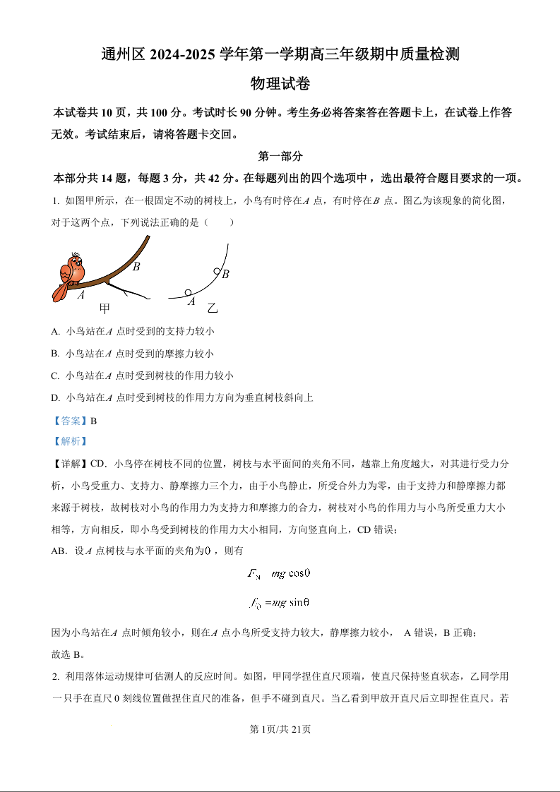北京市通州区2025届高三上学期11月期中质量检测试卷物理(精品解析版)