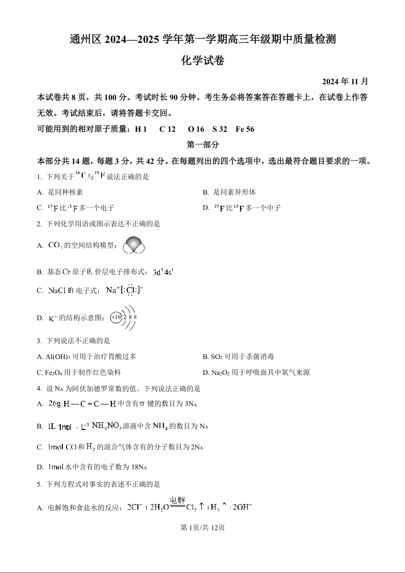 北京市通州区2025届高三上学期11月期中质量检测试卷化学(原卷版)