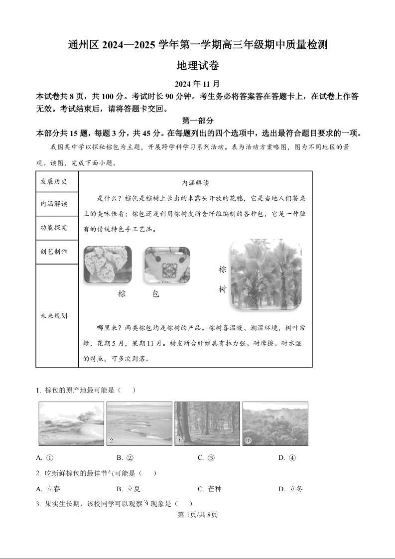 北京市通州区2025届高三上学期11月期中质量检测试卷地理(原卷版)