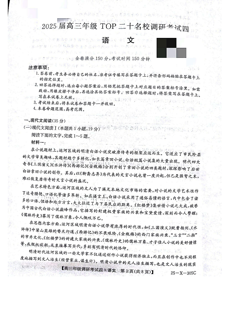 河南省TOP二十名校2025届高三上学期12月调研考试(四)语文