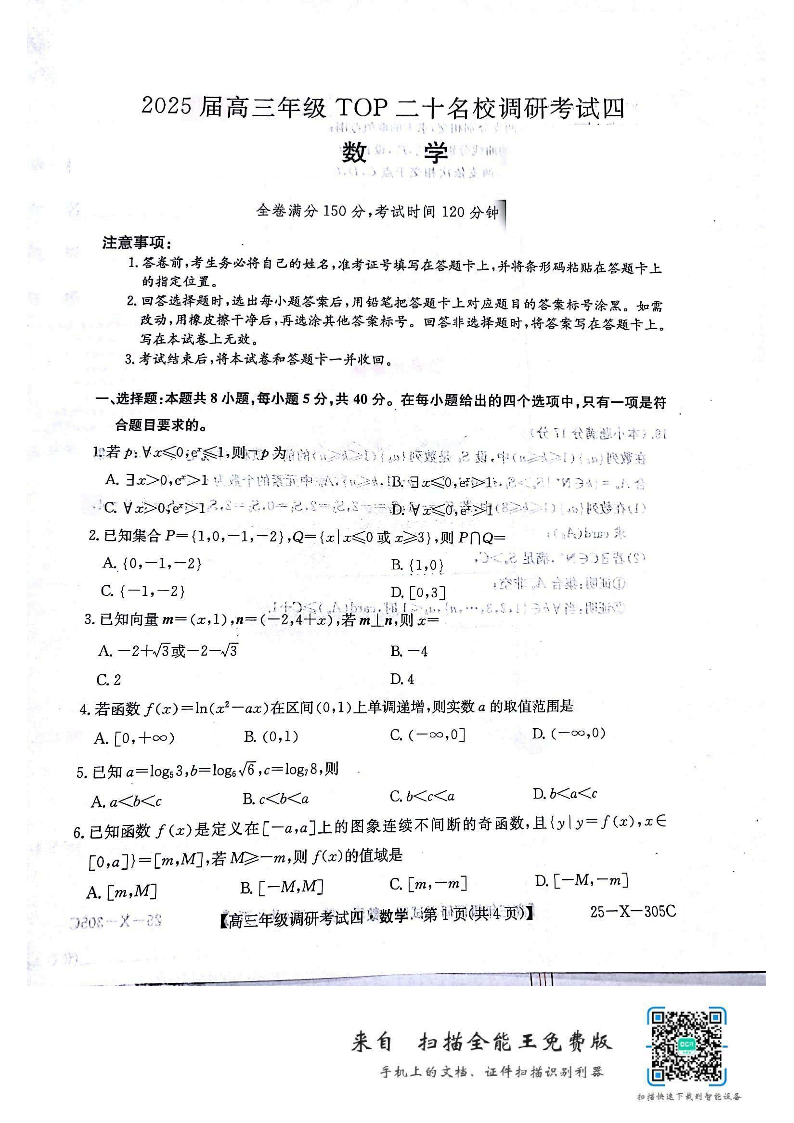 河南省TOP二十名校2025届高三上学期12月调研考试(四)数学