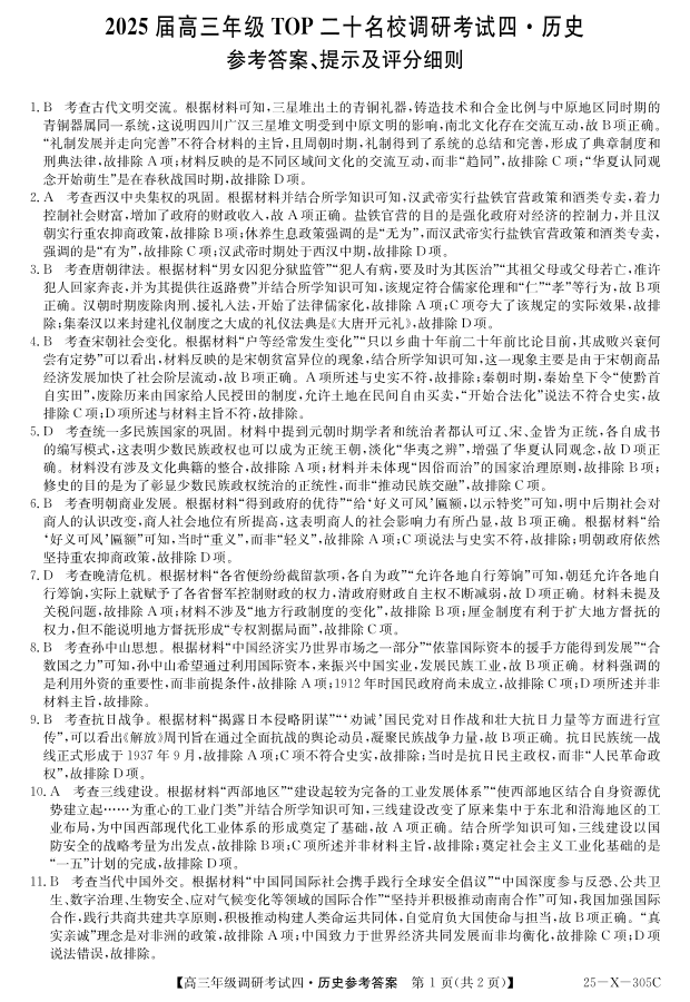 河南省TOP二十名校2025届高三上学期12月调研考试(四)历史答案