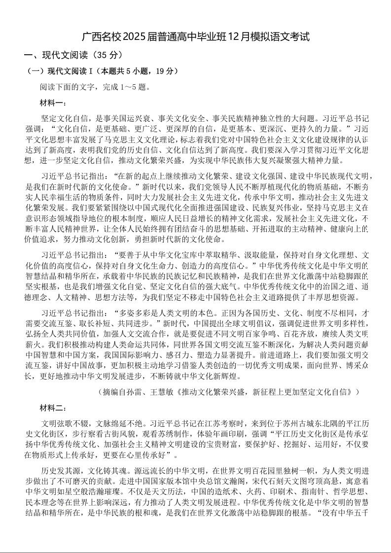 广西省贵港市名校2025届普通高中毕业班12月模拟考试语文含答案细则