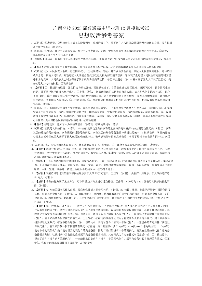 广西省贵港市名校2025届普通高中毕业班12月模拟考试政治答案