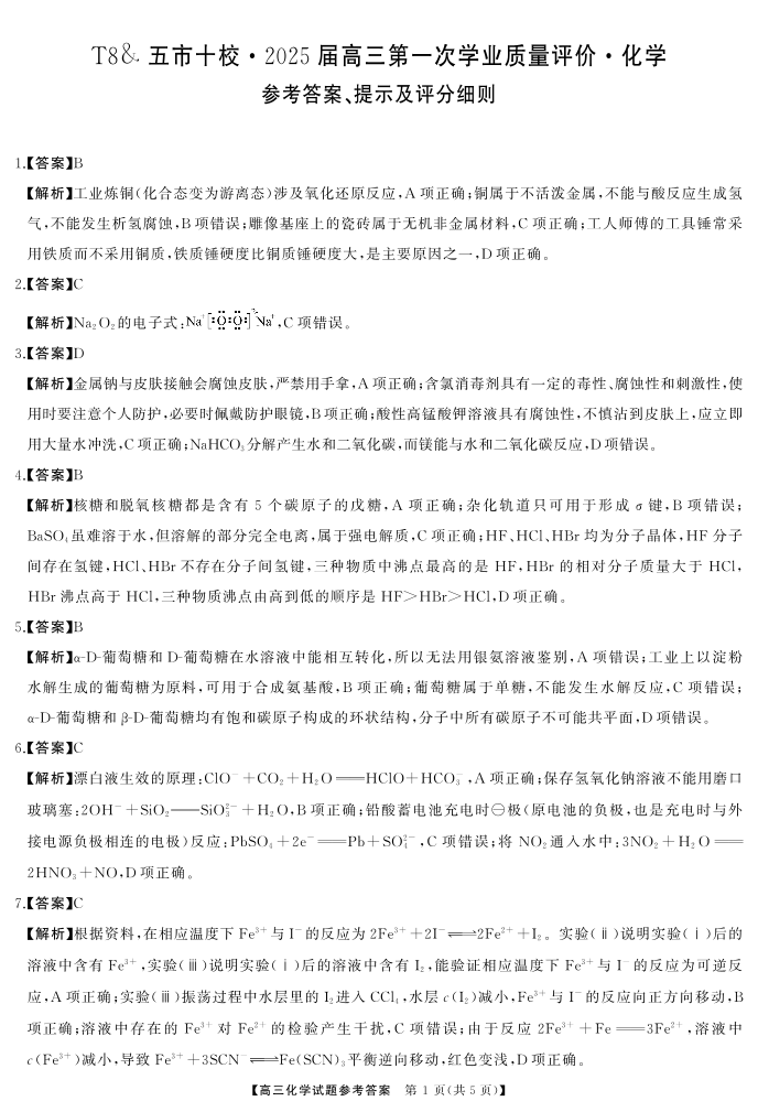 湖南省T8&. 五市十校•2025届高三第一次学业质量评价化学答案