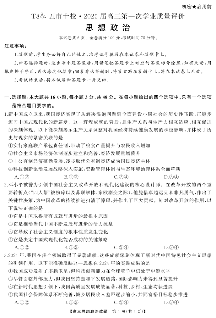 湖南省T8&. 五市十校•2025届高三第一次学业质量评价政治