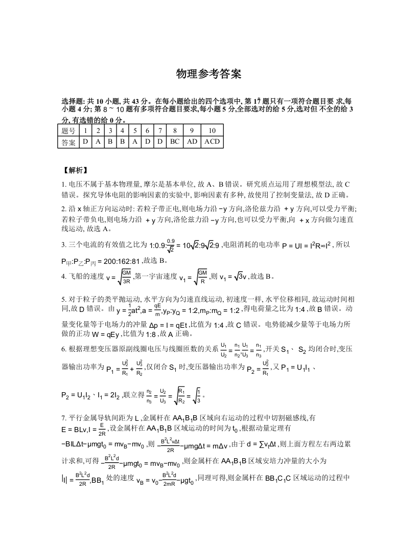 重庆市巴蜀中学2025届高考适应性月考卷(四)物理答案