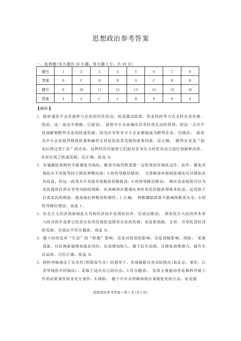 重庆市巴蜀中学2025届高考适应性月考卷(四)政治答案