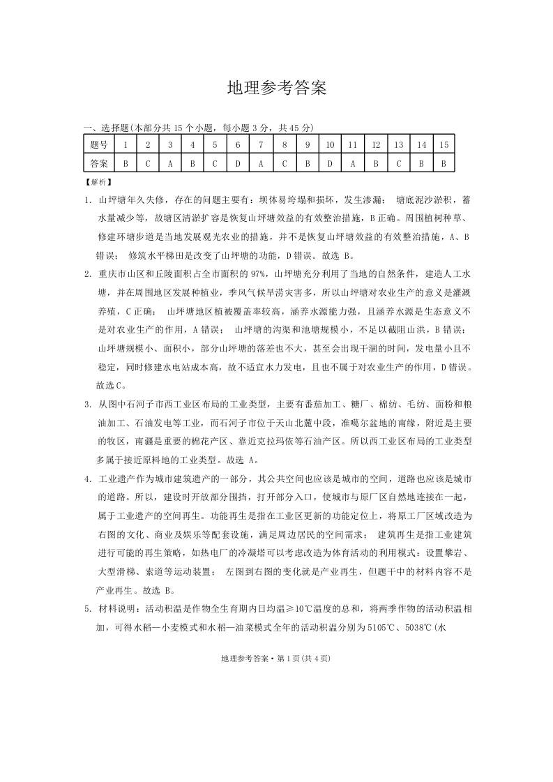 重庆市巴蜀中学2025届高考适应性月考卷(四)地理答案