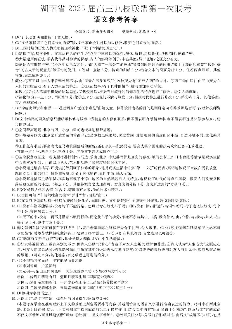 湖南省 2025 届高三九校联盟第一次联考语文答案