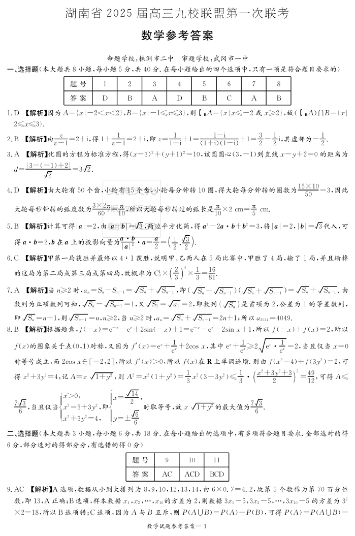 湖南省 2025 届高三九校联盟第一次联考数学答案