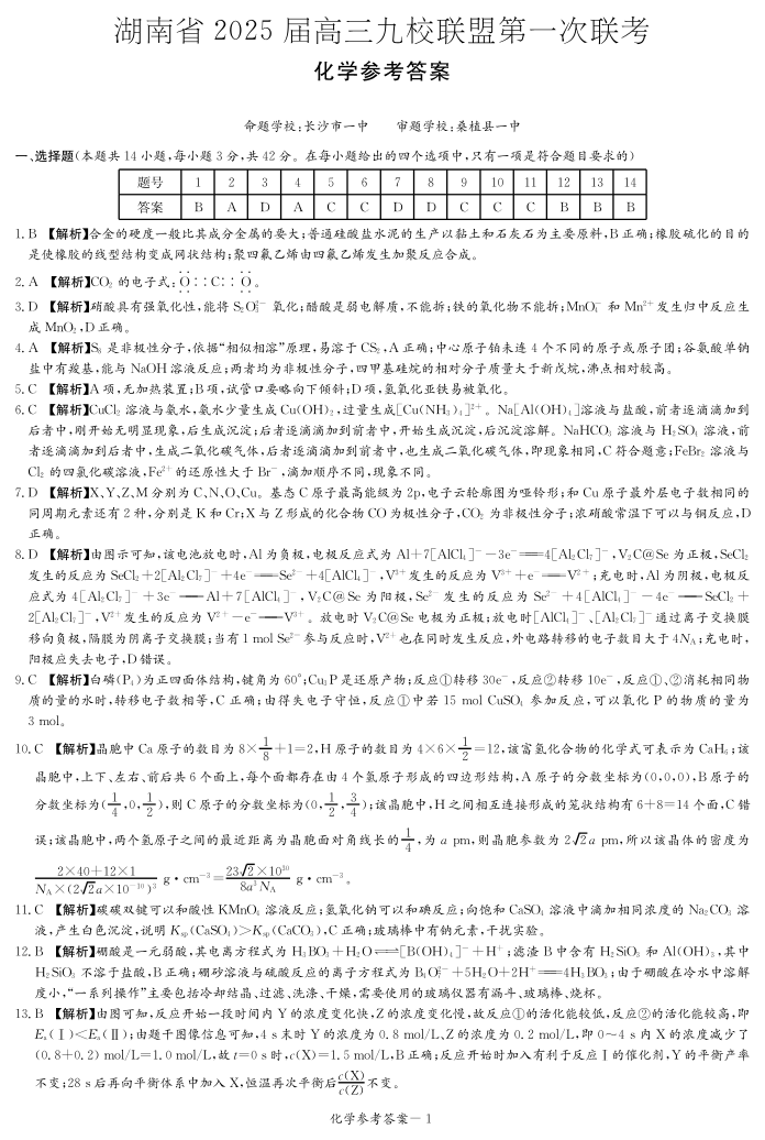 湖南省 2025 届高三九校联盟第一次联考化学答案