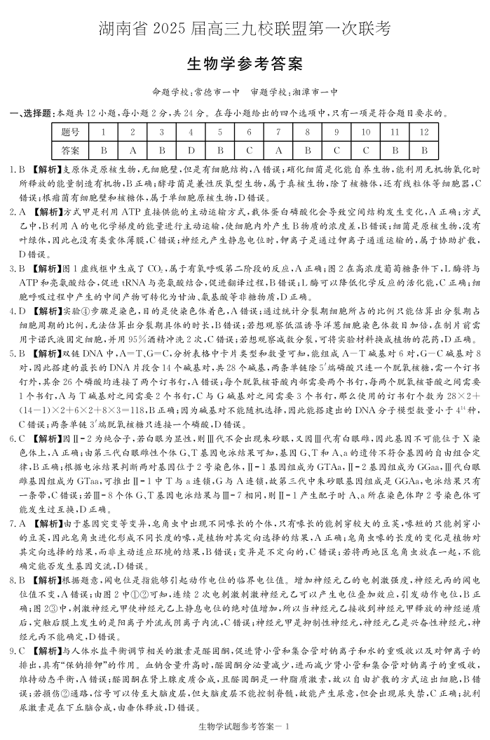 湖南省 2025 届高三九校联盟第一次联考生物答案