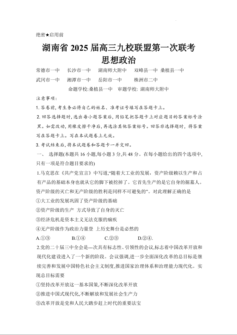 湖南省 2025 届高三九校联盟第一次联考政治