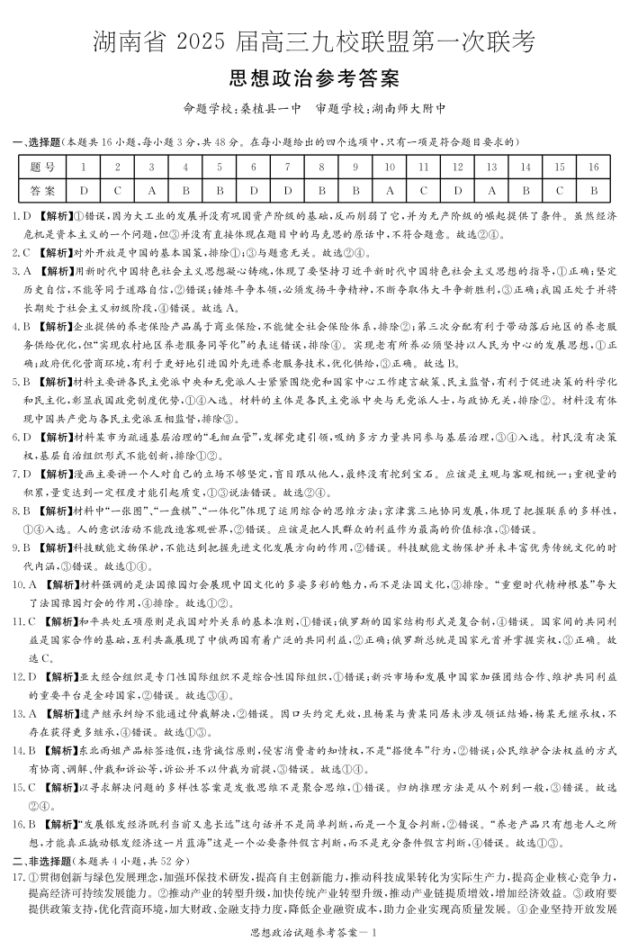 湖南省 2025 届高三九校联盟第一次联考政治答案