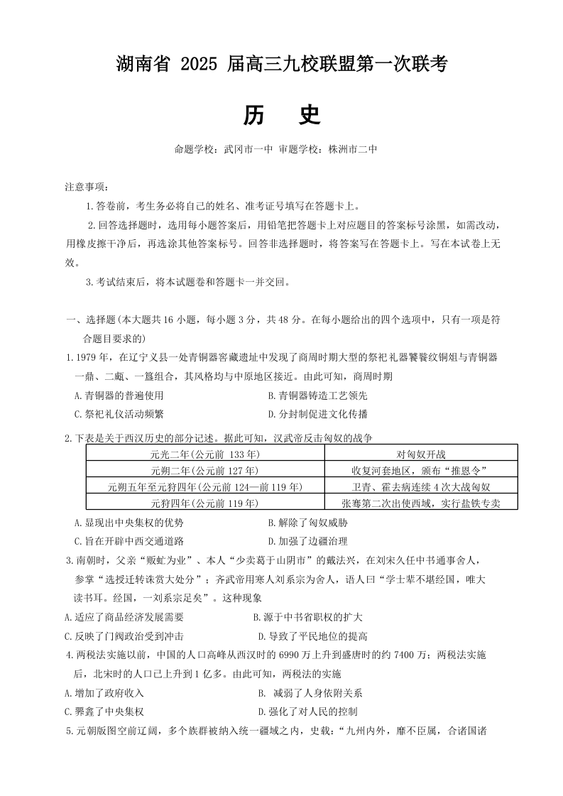 湖南省 2025 届高三九校联盟第一次联考历史