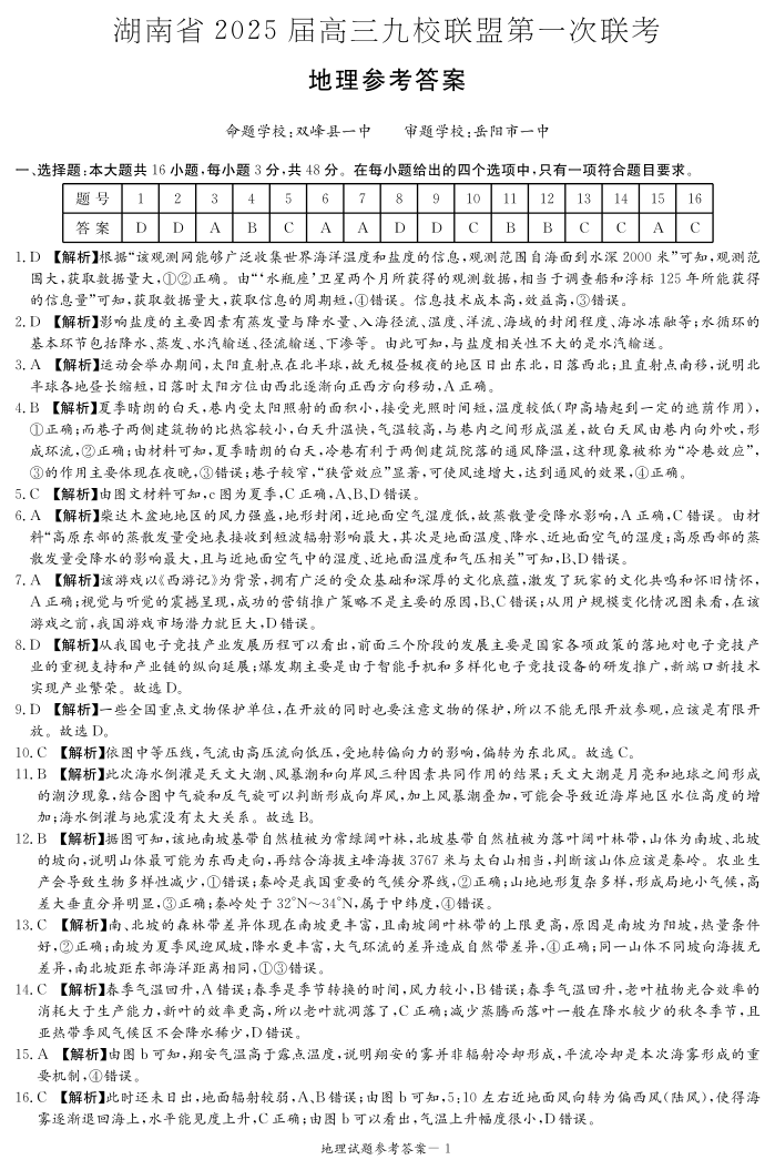 湖南省 2025 届高三九校联盟第一次联考地理答案