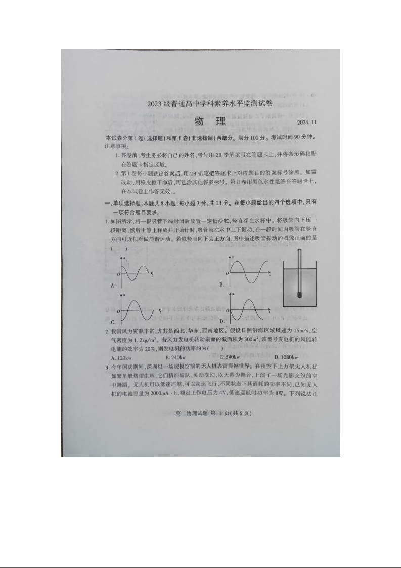 山东省临沂市2024-2025学年上学期高二学科素养水平监测物理