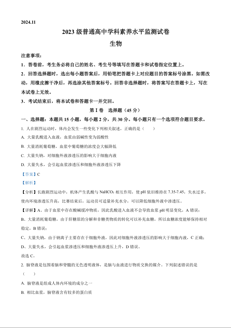 山东省临沂市2024-2025学年上学期高二学科素养水平监测生物(精品解析版)