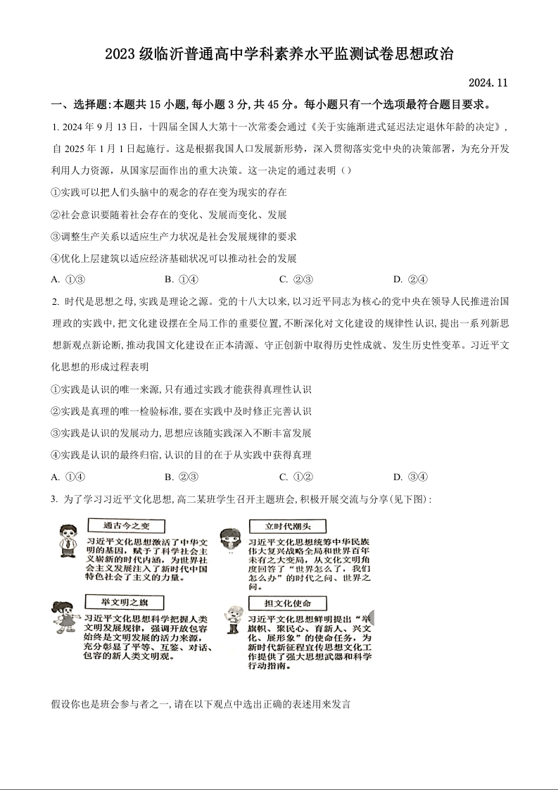 山东省临沂市2024-2025学年上学期高二学科素养水平监测政治(原卷版)