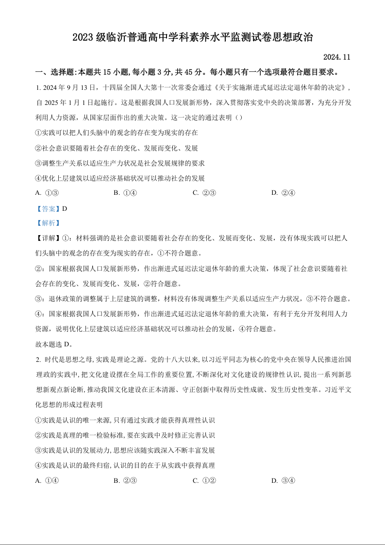 山东省临沂市2024-2025学年上学期高二学科素养水平监测政治(精品解析版)