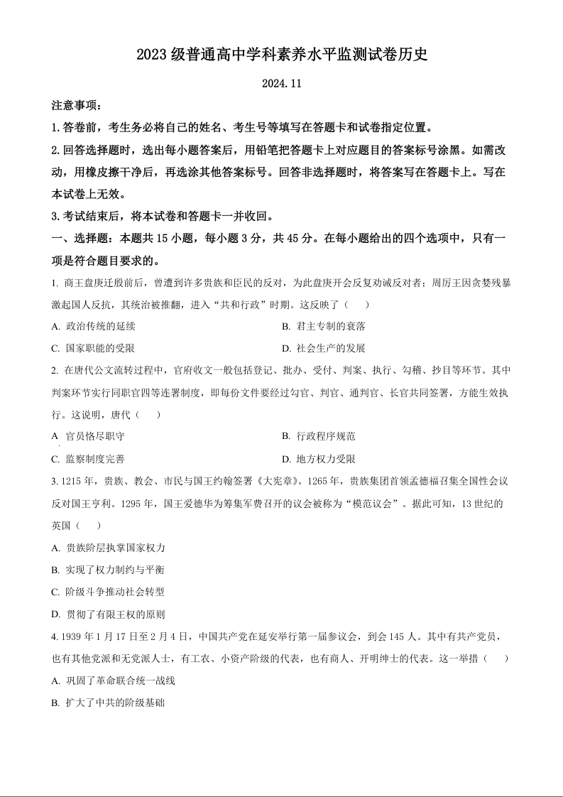 山东省临沂市2024-2025学年上学期高二学科素养水平监测历史(原卷版)