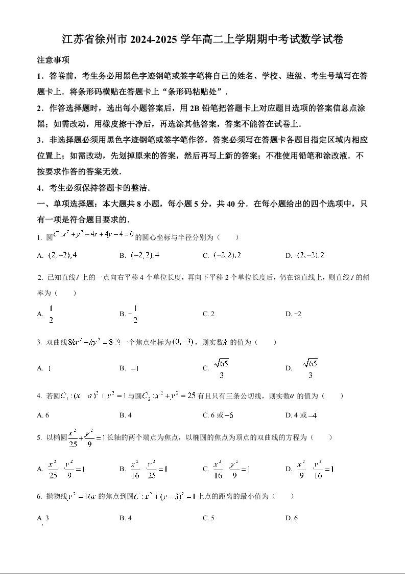 江苏省徐州市2024-2025学年高二上学期期中考试数学(原卷版)