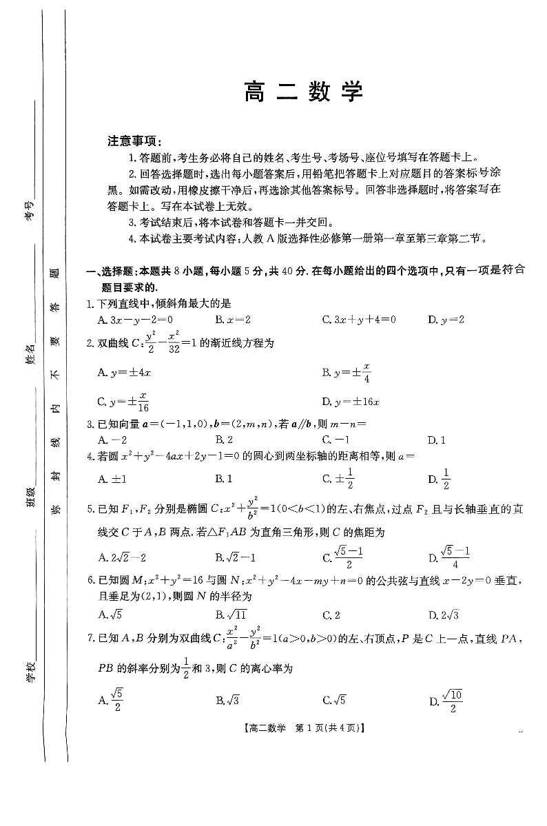 广东省部分名校2024-2025学年高二上学期12月联合检测数学