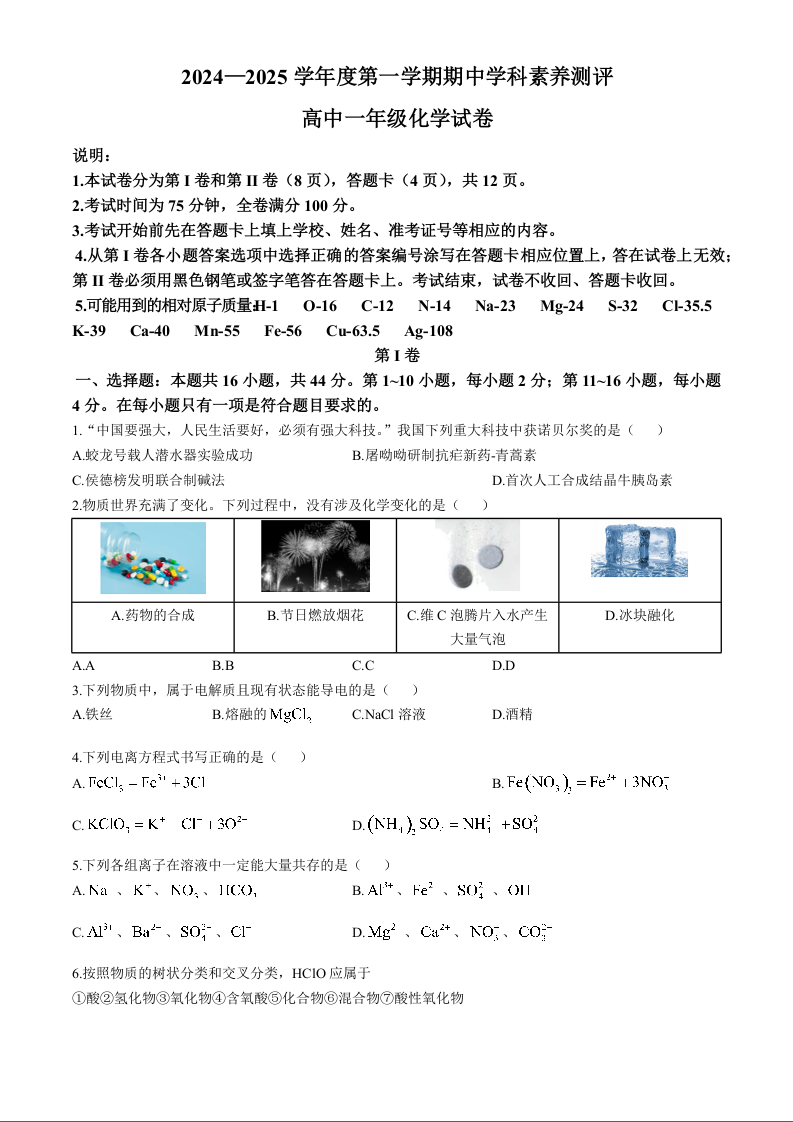 广东省茂名市2024-2025学年度上学期高一期中学科素养测评化学含答案解析