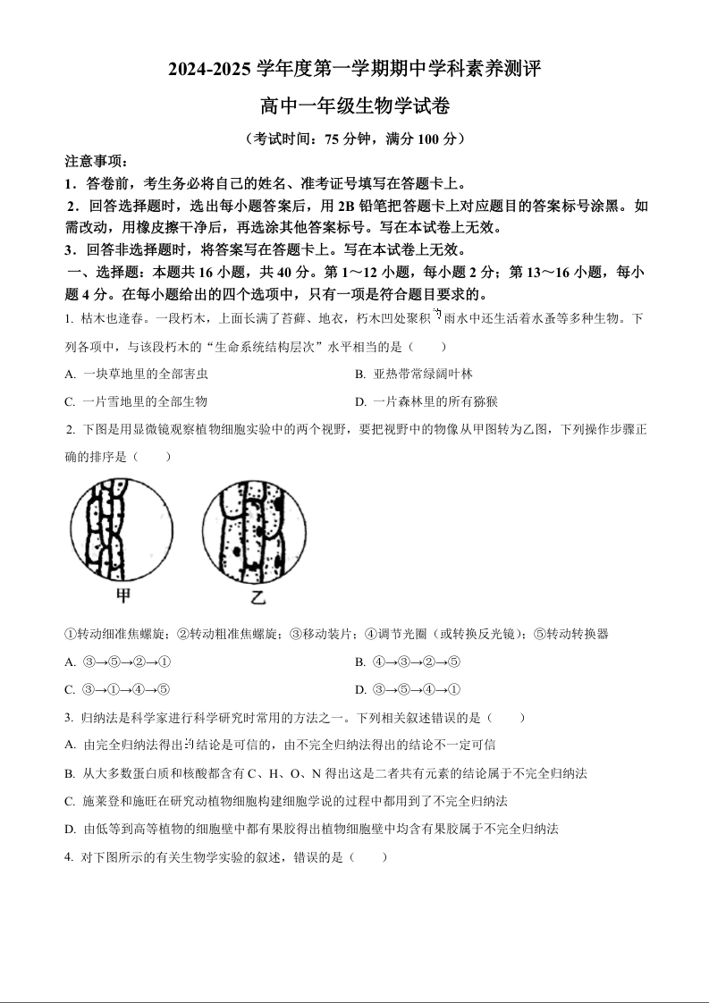 广东省茂名市2024-2025学年度上学期高一期中学科素养测评生物(原卷版)