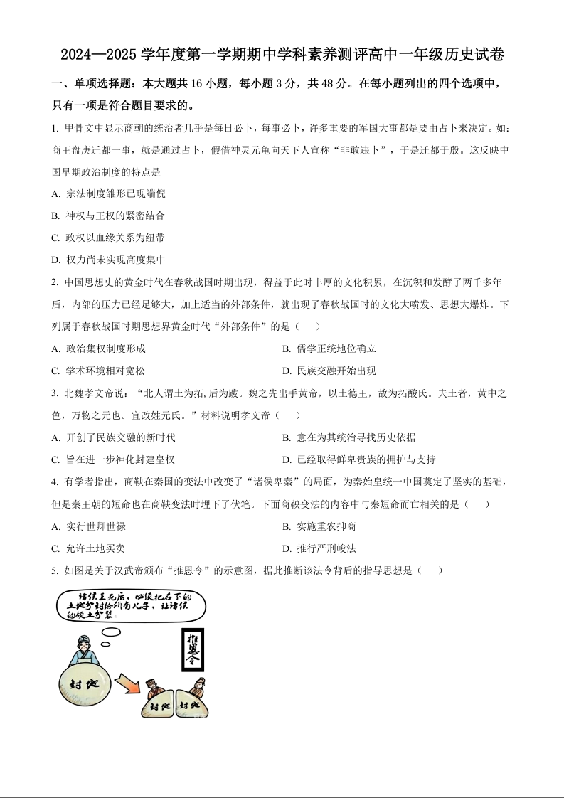 广东省茂名市2024-2025学年度上学期高一期中学科素养测评历史(原卷版)