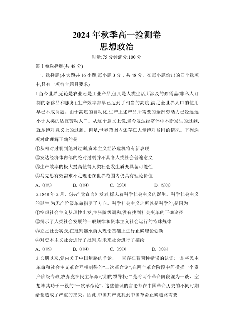 湖南省长沙市长郡中学2024-2025学年高一上学期12月月考政治