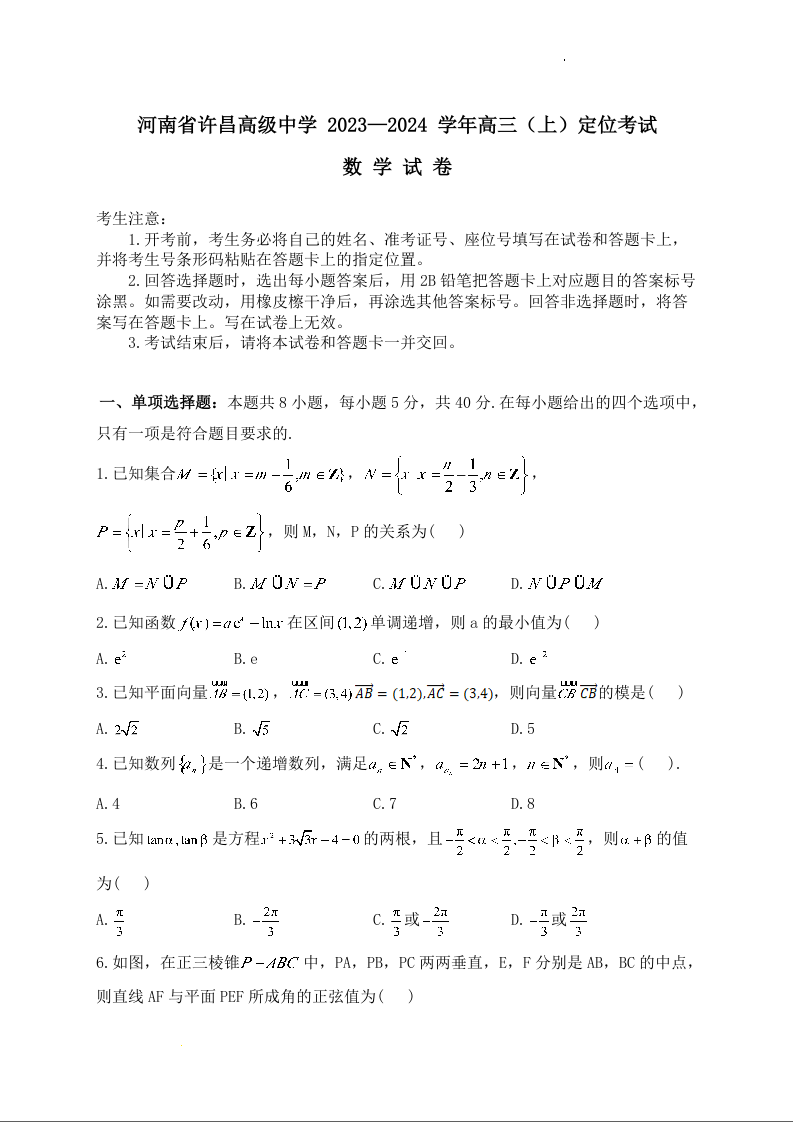 河南省许昌高级中学2024.9高三年级开学定位考试数学