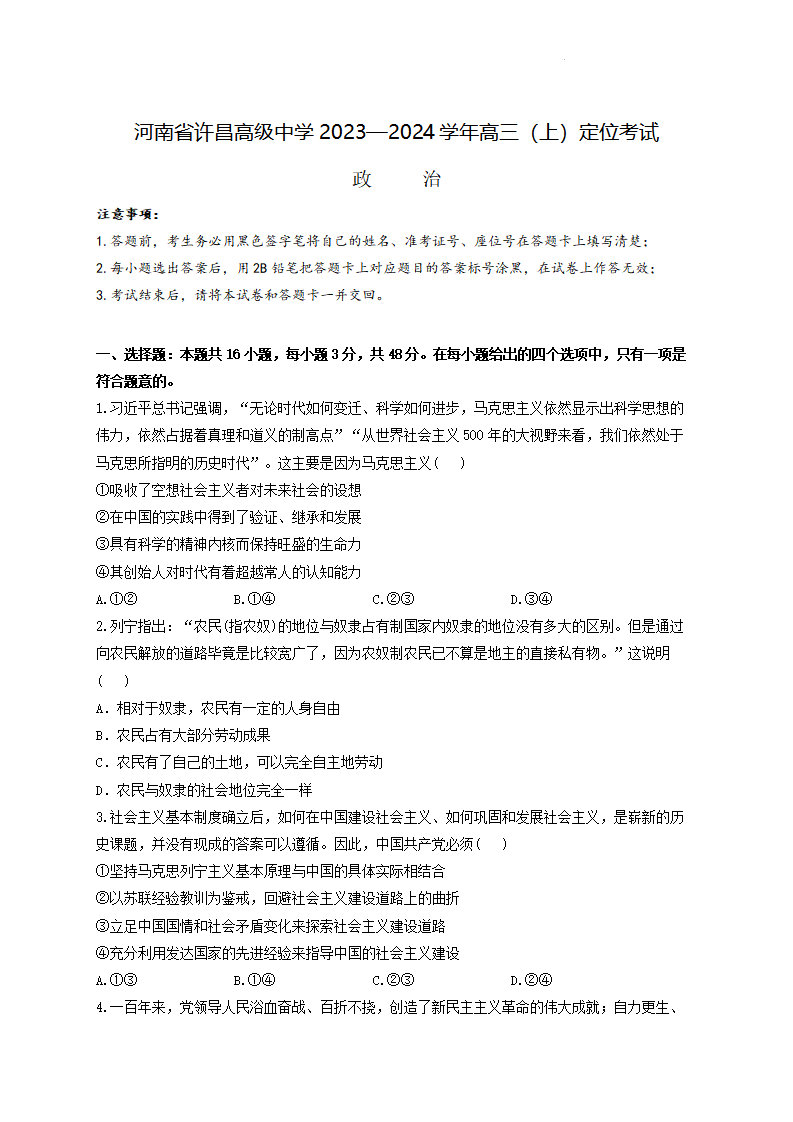 河南省许昌高级中学2024.9高三年级开学定位考试政治