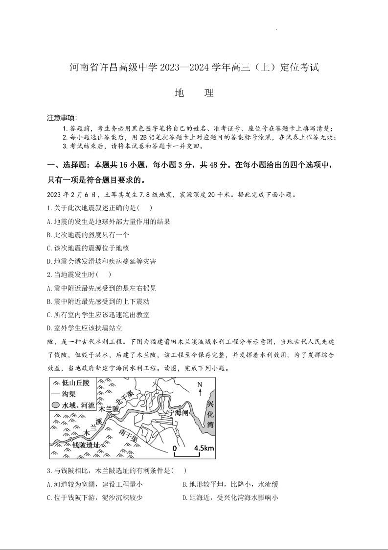 河南省许昌高级中学2024.9高三年级开学定位考试地理