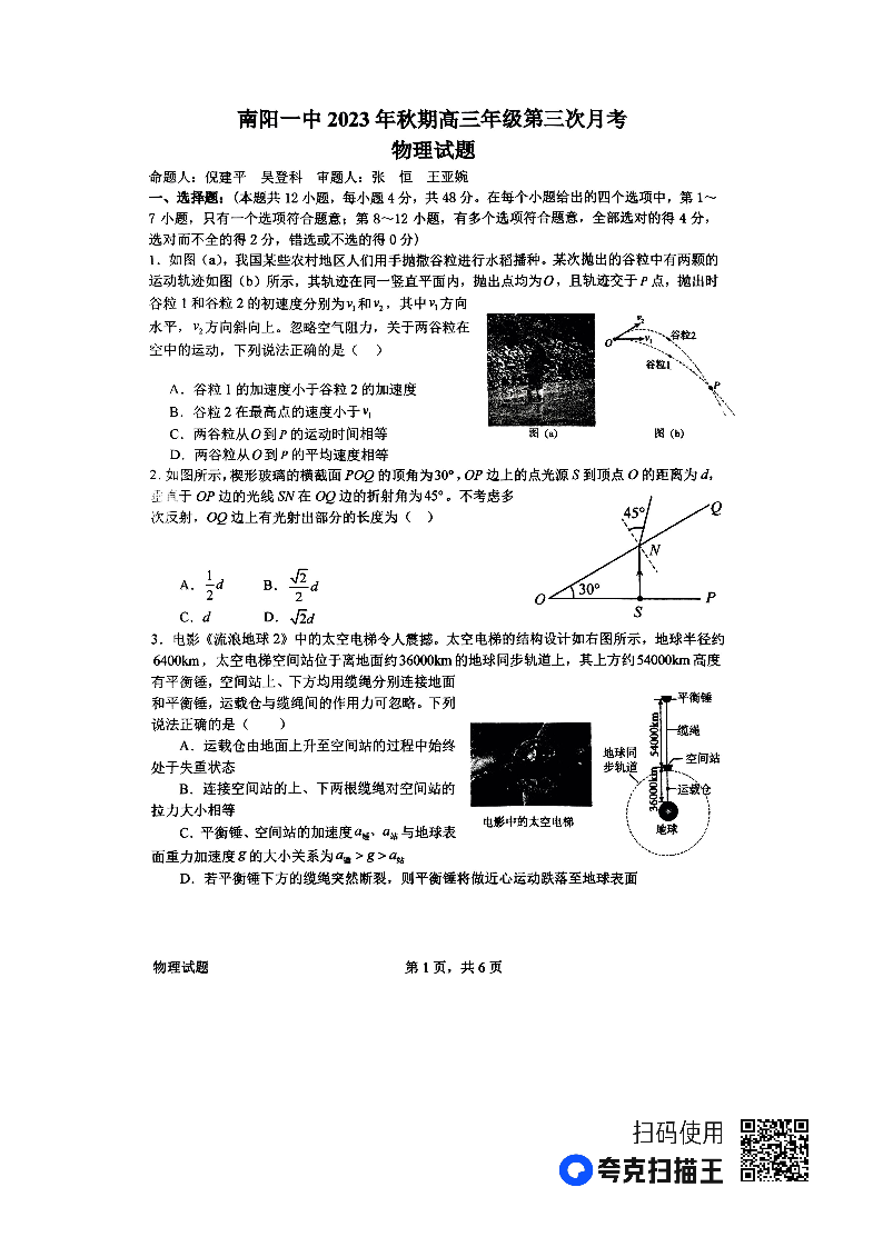 河南省南阳市第一中学2023.10高三年级第三次月考物理+答案解析