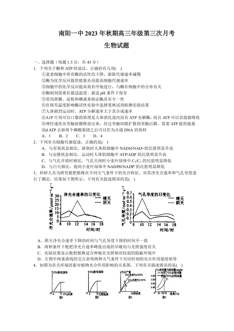 河南省南阳市第一中学2023.10高三年级第三次月考生物+答案解析