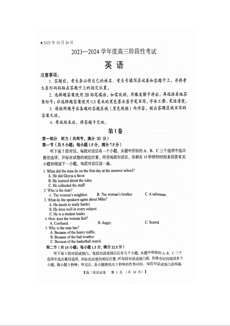 河南省三门峡市2023.10高三年级阶段性考试英语