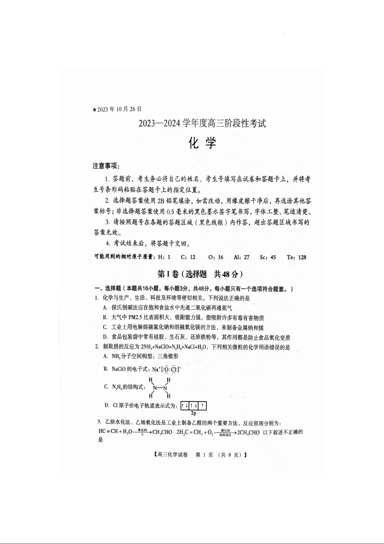河南省三门峡市2023.10高三年级阶段性考试化学