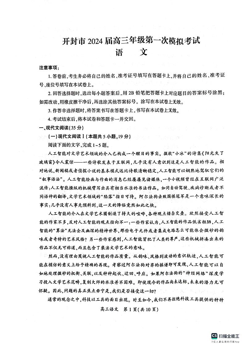 2024届河南省开封市高三上学期第一次模拟考试 语文