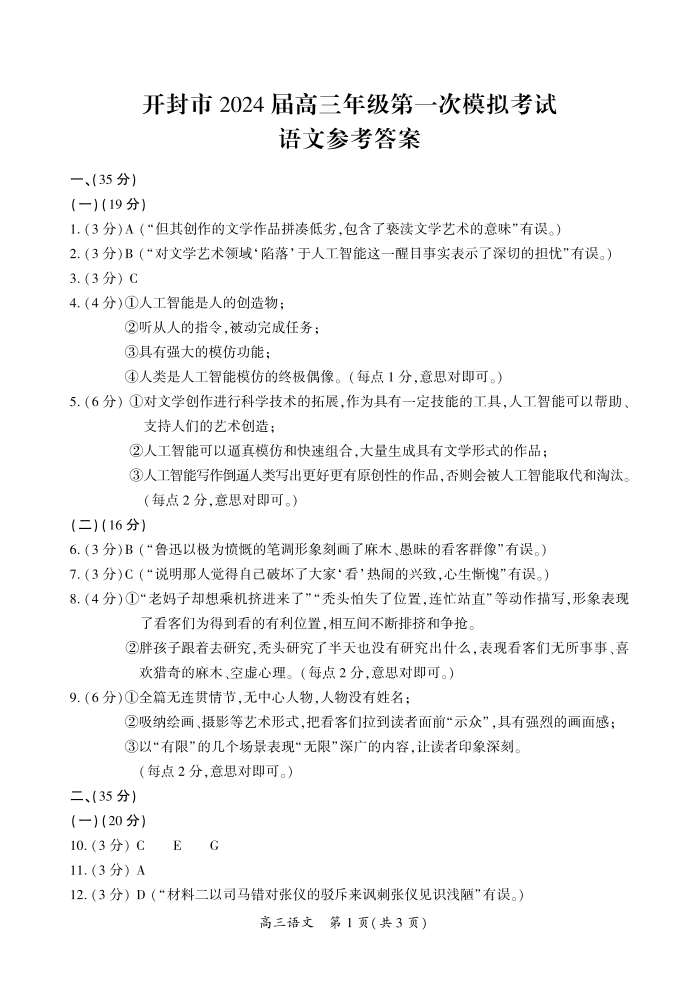 2024届河南省开封市高三上学期第一次模拟考试 语文答案