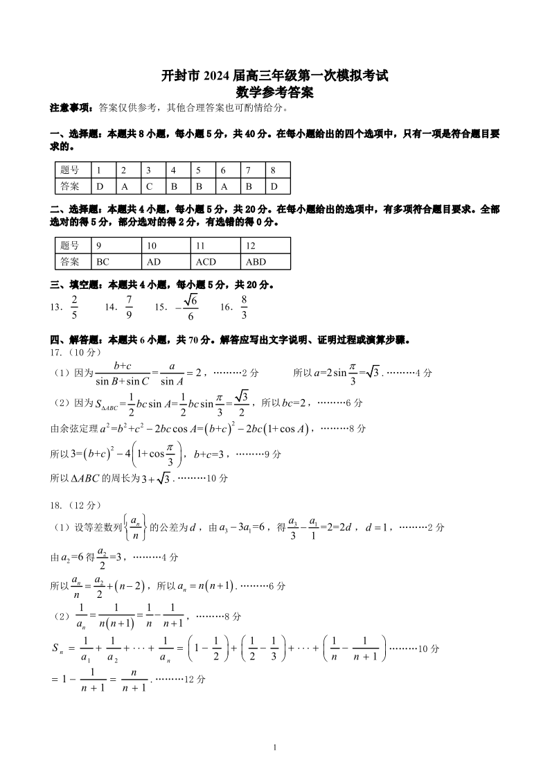 河南省开封市2023.12高三年级第一次模拟考试数学答案