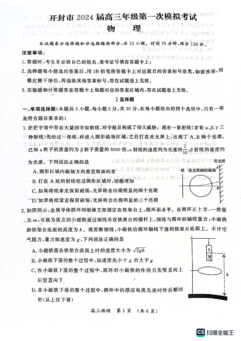 河南省开封市2023.12高三年级第一次模拟考试物理